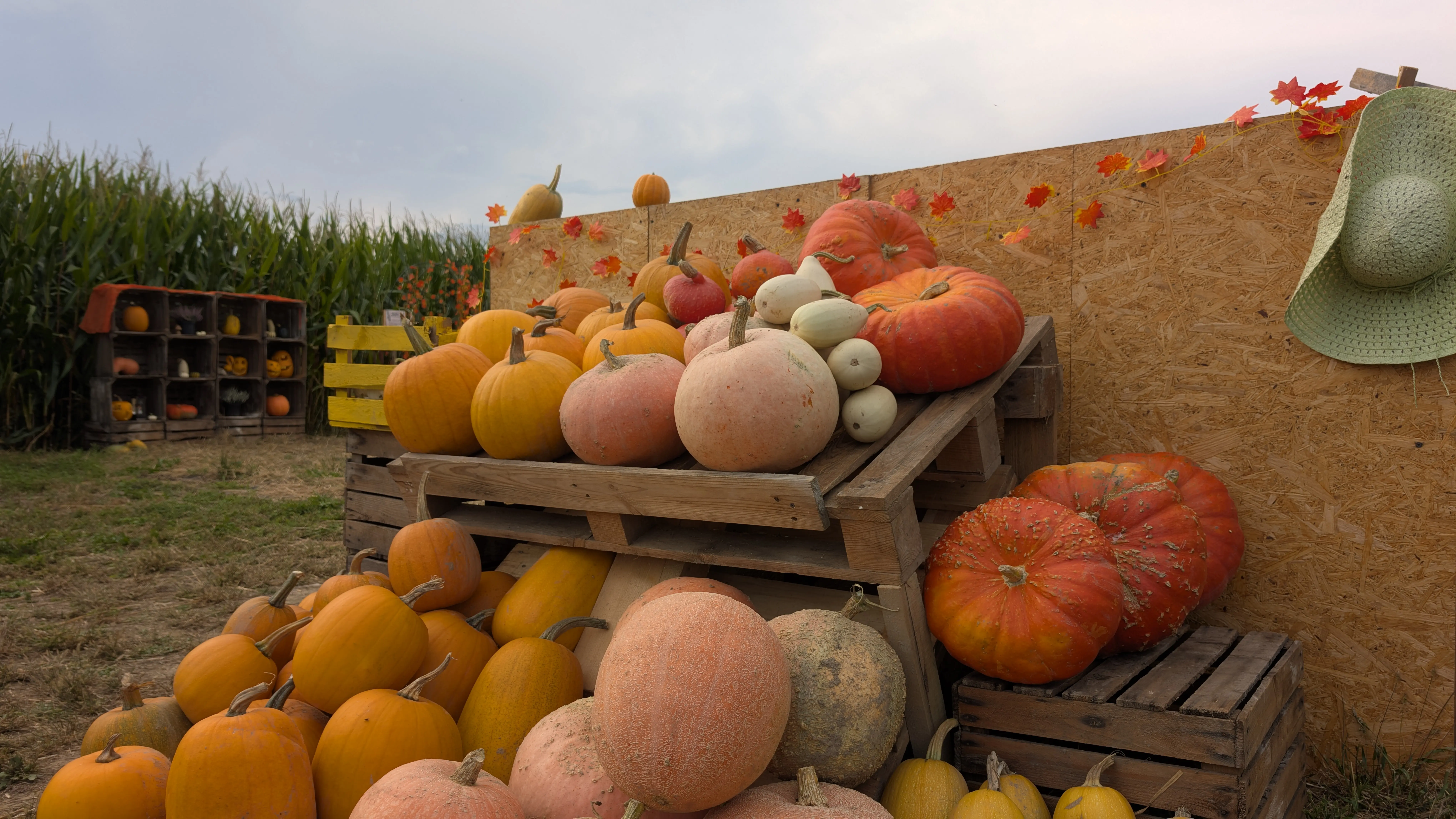 Altanka ze sztucznymi kwiatami i dynami, ramka z widokiem na pole, zdjęcie przy traktorze i ściana ze skrzynek po jabłkach.